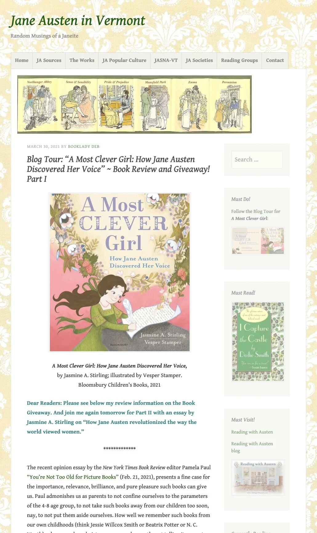 In light of Women’s History Month, I’m pleased to share my review of a beautiful new book by Jasmine A. Stirling that is sure to delight the hearts of Jane Austen fans of all ages entitled A Most Clever Girl: How Jane Austen Found Her Voice.